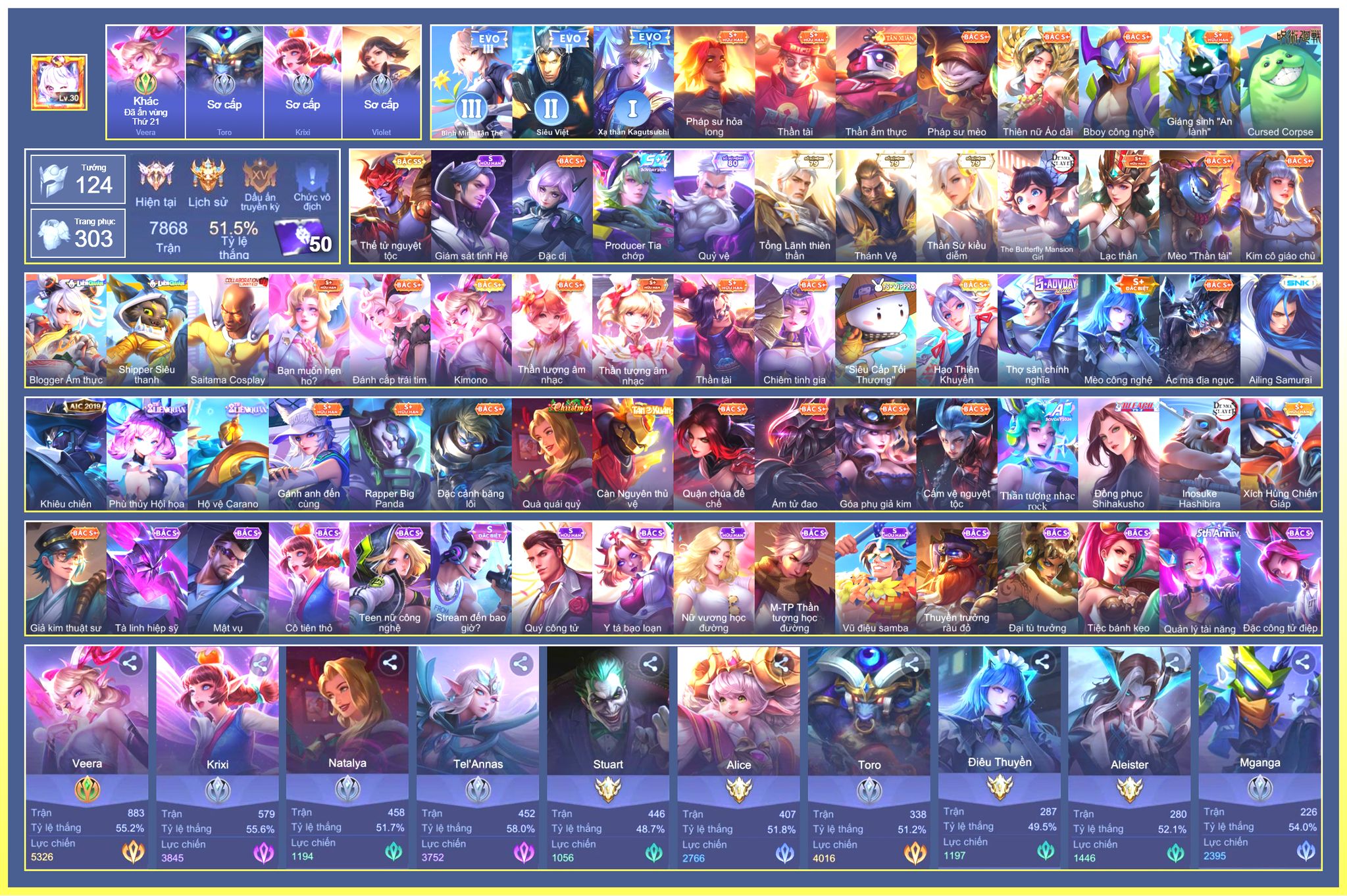 Nổi bật: Full Tướng.Full Ngọc.Dư 59K Vàng.Triệu Vân Kỵ Sĩ Tận Thế.Violet Thần Long Tỷ Tỷ.Yorn Thế Tử Nguyệt Tộc.Butterfly Nữ Quái Nổi Loạn.Valhein Vũ Khí Tối Thượng.Omen Đao Phủ Tận Thế.Alllain Thần Mặt Trời.ilumia Thần Mặt Trời.Butterfly Bình Mình Tận Thế.Veres Gián Điệp Tinh Hệ...
