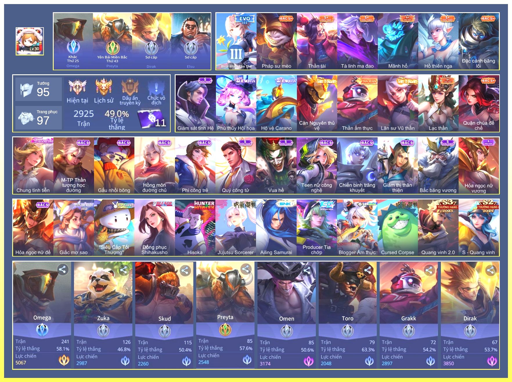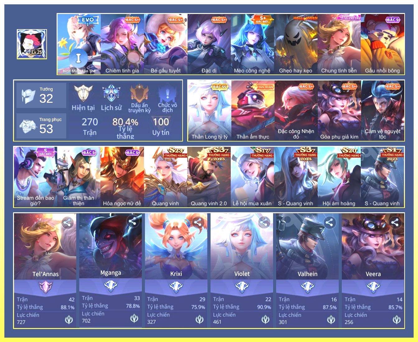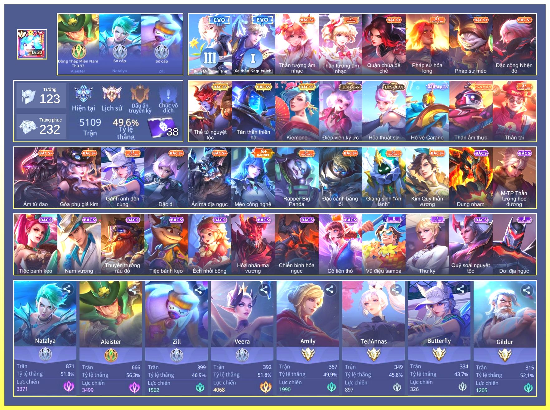 Nổi bật: Full Tướng.Full Ngọc.Dư 4 Đá Quý.Lữ Bố Tiệc Bãi Biển.Valhein Xạ Thần.Butterfly Bình Minh Tận Thế.Allain Lân Sư Vũ Thần.Grakk Thần Ẩm Thực...