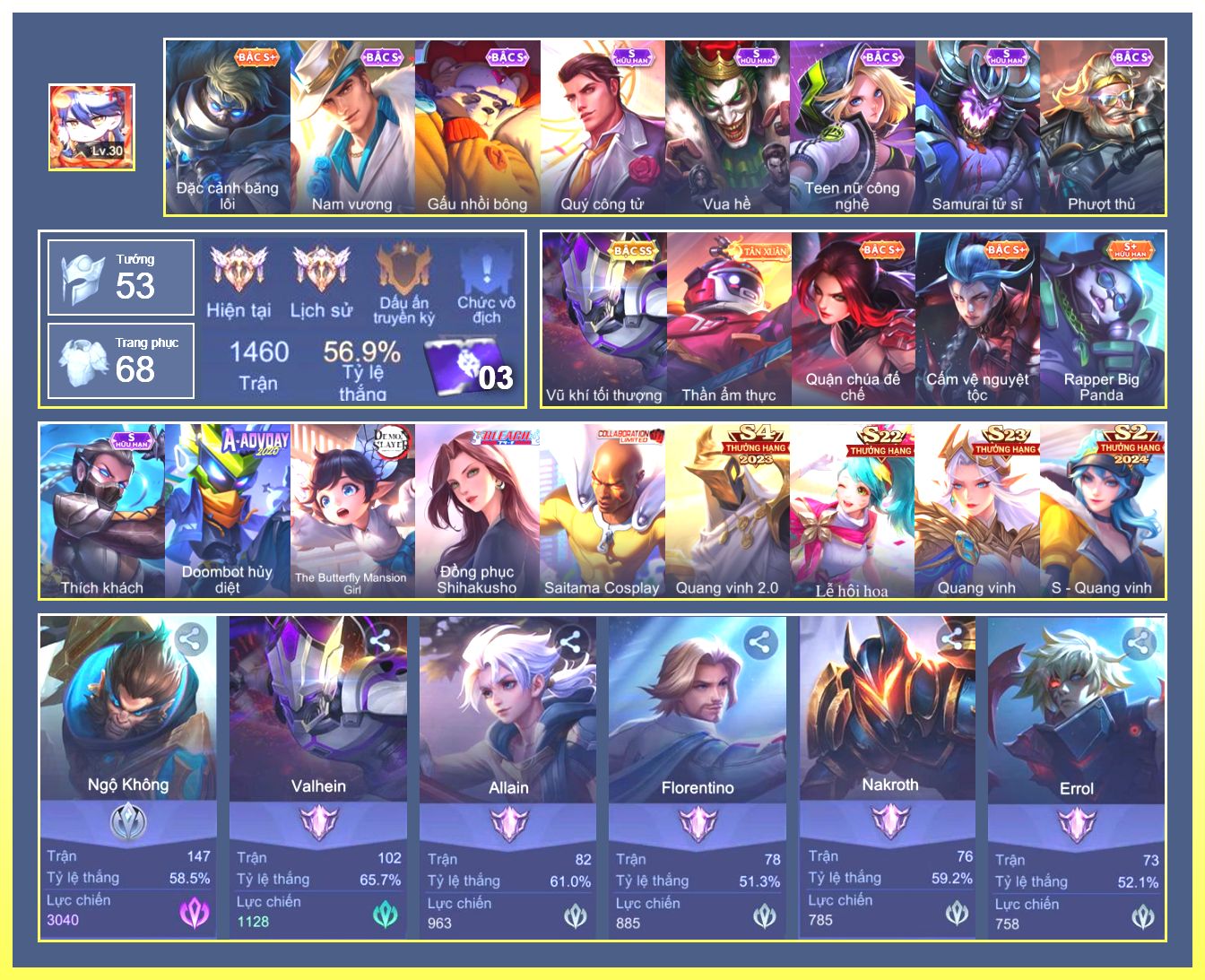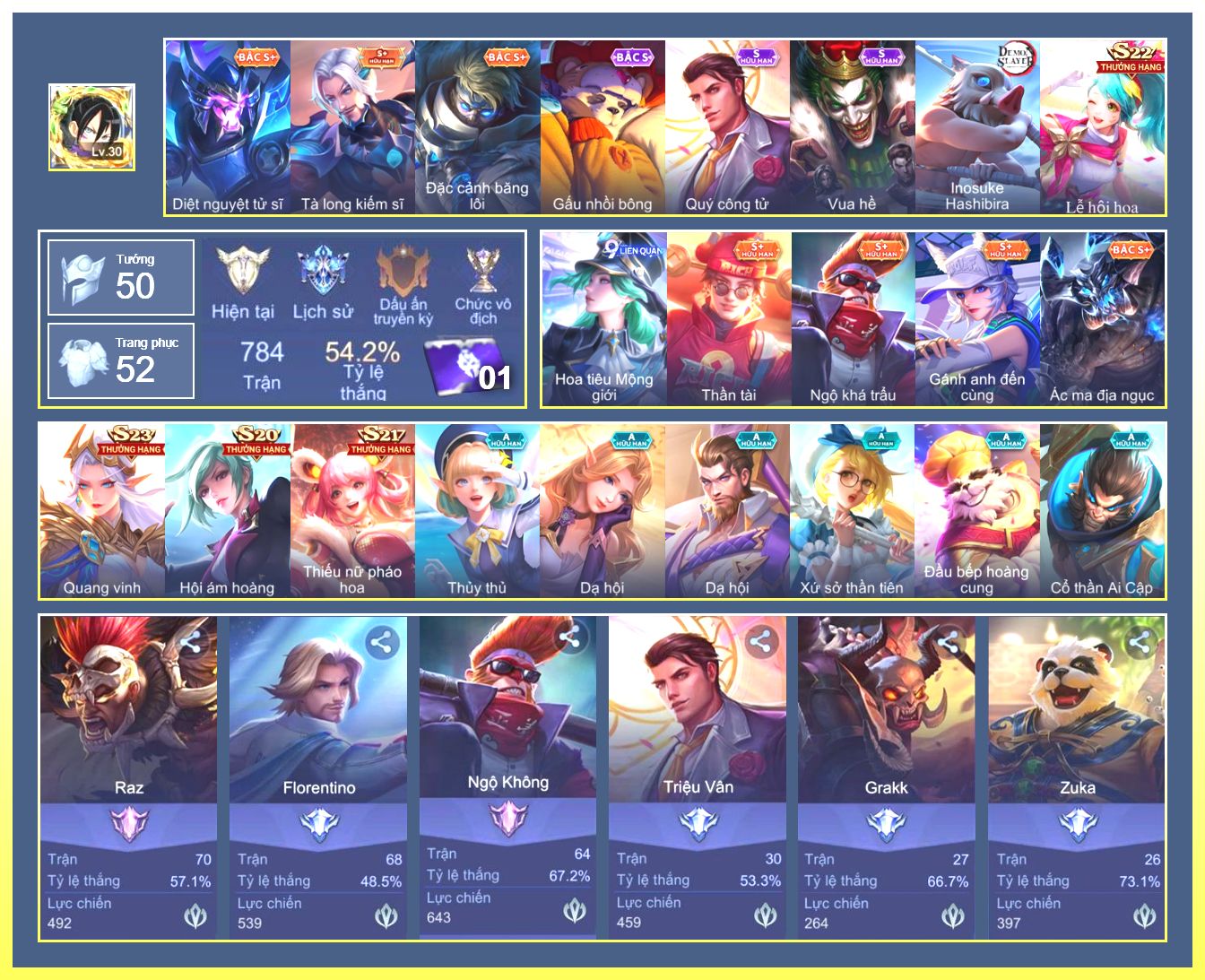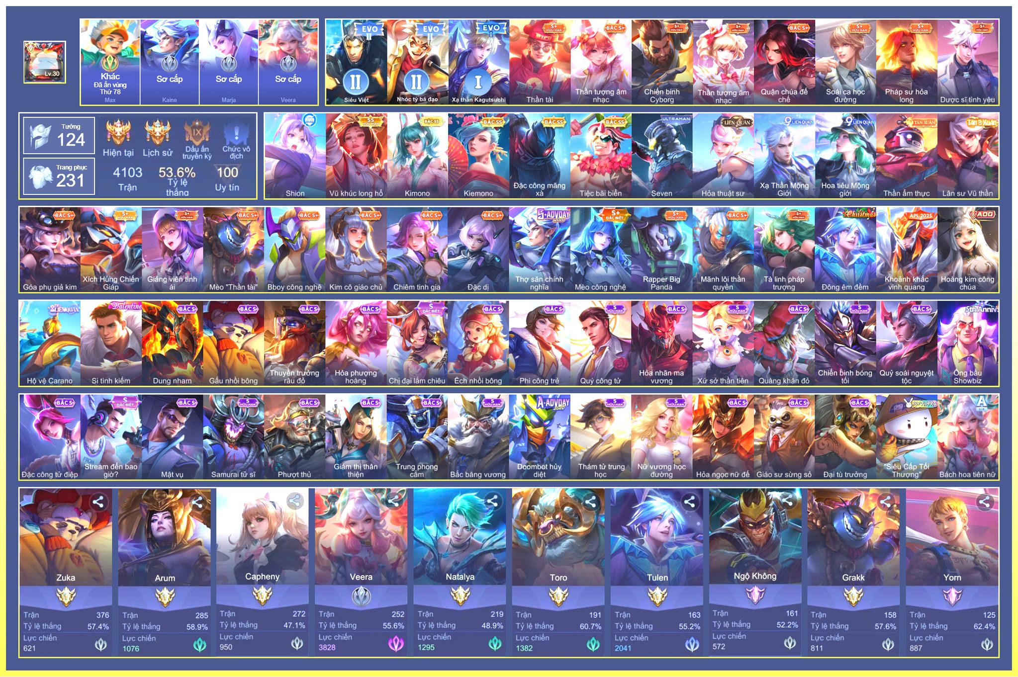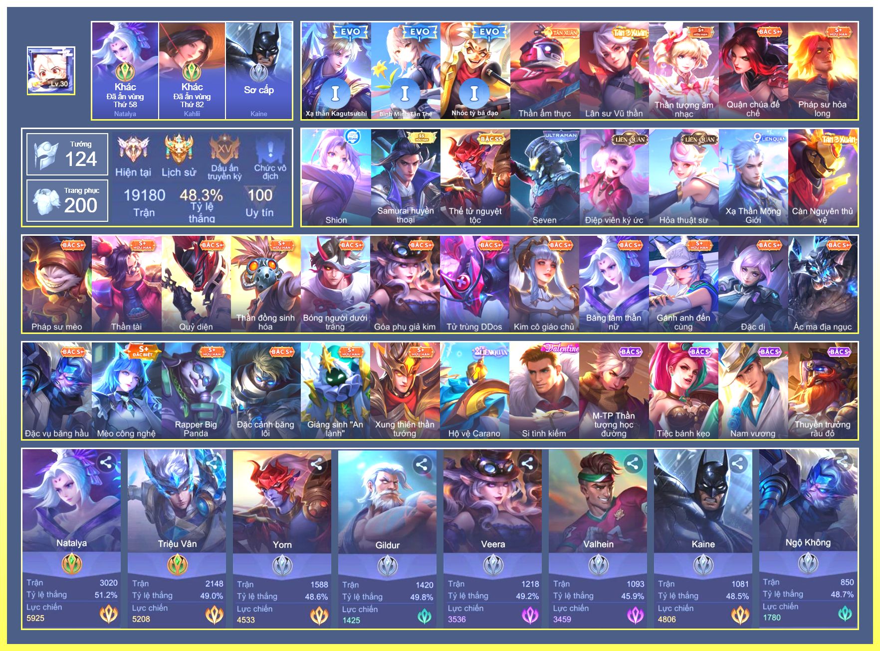 Nổi bật: Rất Nhiều Skin Đẹp Vip.Ngọc 90.Dư 6 Đá Quý.Lauriel Thánh Quang Sứ.Zuka Gấu Nhồi Bông.Butterfly Bình Minh Tận Thế.Nak Producer Tia Chớp.Liliana Thần Tượng Âm Nhạc....